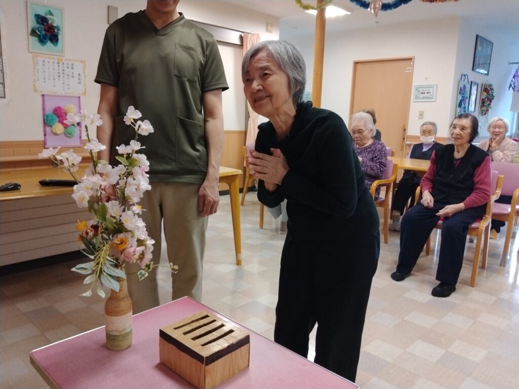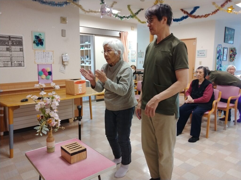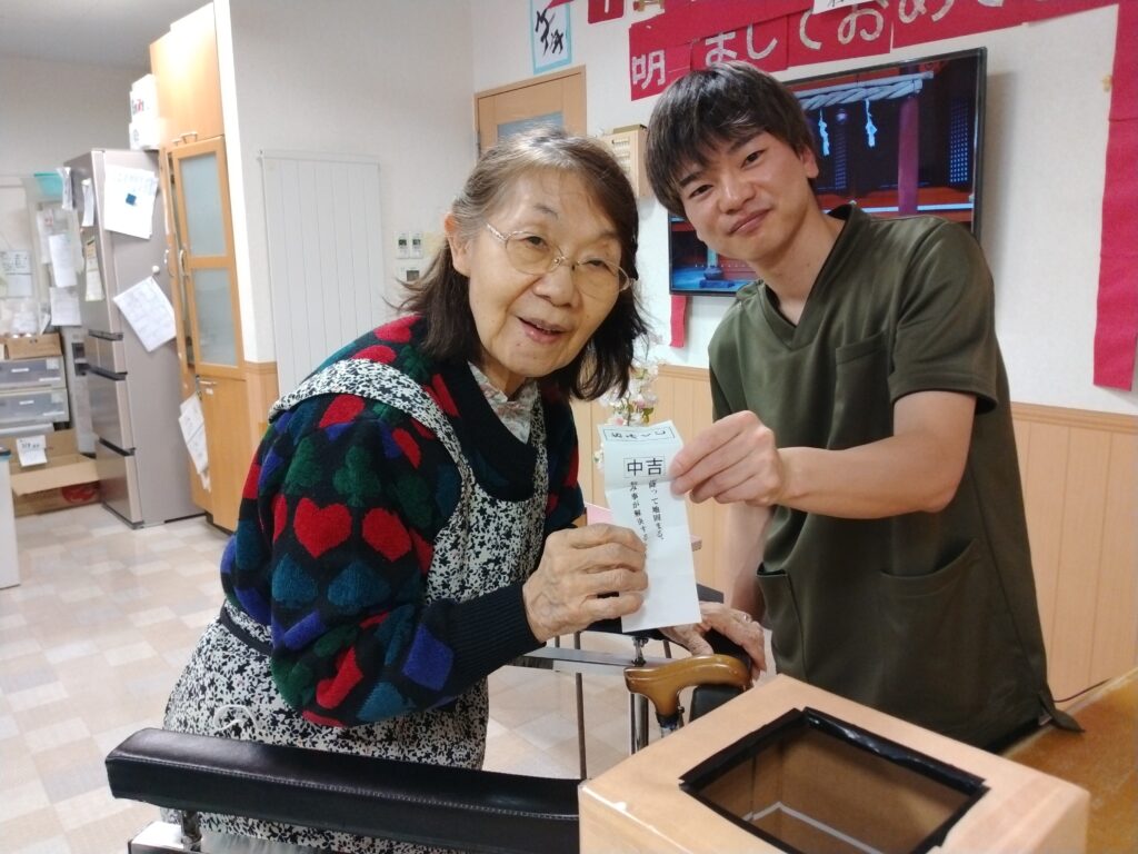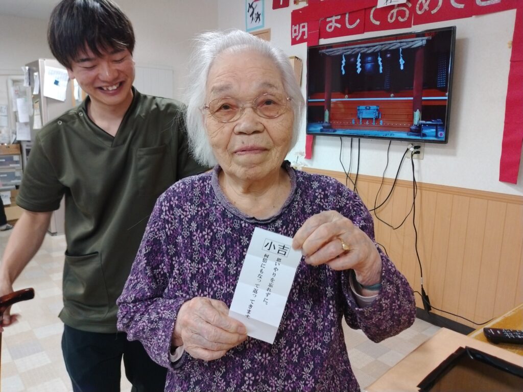 ☆初詣☆貝塚神社にて! 2026 2/17 グループ 貝塚 2026年2月17日 もう二月となりました。 お正月が懐かしく感じますね(笑) お正月と言えば初詣ですよね。皆さんはお参りに行かれましたか? 今年の初詣は施設内に神社を作って、参拝して頂きました⛩ 参拝をしました。新年がいい年でありますように 参拝した後は、職員手作りのおみくじを引きました。 おみくじの内容を読んで「一年場頑張るぞー」と笑いながら話している利用者様もいました 2026年もどうぞ宜しくお願いします‼‼ グループ 貝塚 ☆クリスマス飾り☆ グループホーム貝塚